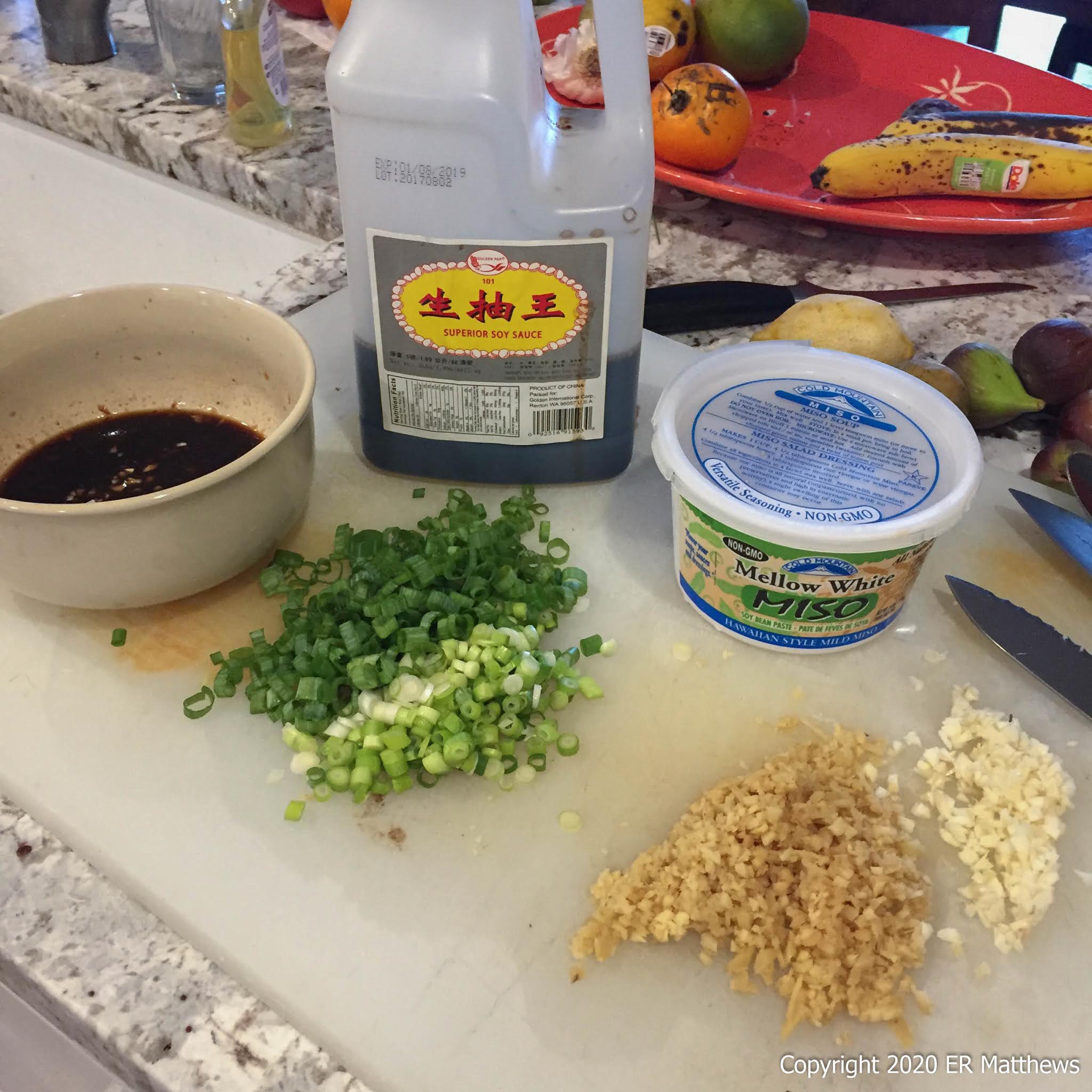Here are all my seasonings and the finished soy-lime sauce to spoon over both the meatloaf and the roasted broccoli. The seasonings for the meatloaf are soy sauce, shiromiso (white miso), garlic, ginger, and green onions.
